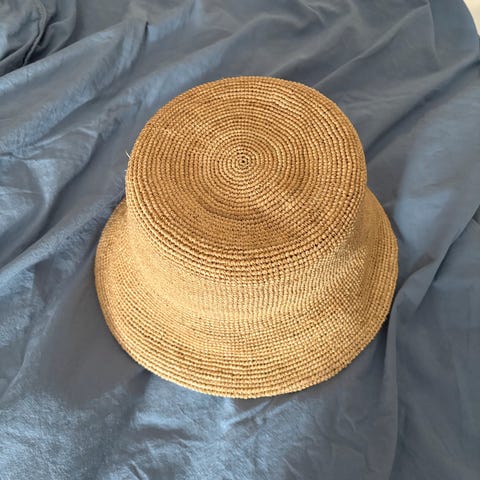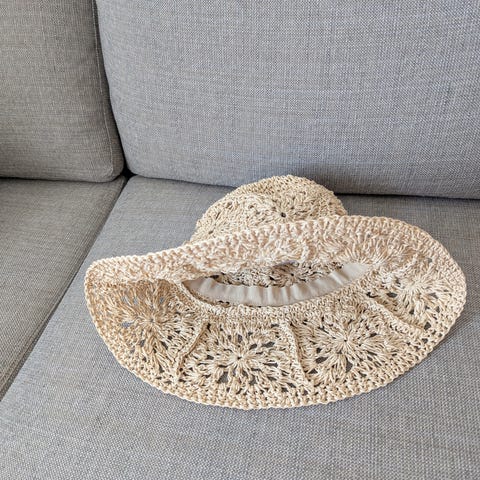 Sommerens tilbehør eller solhatt; basket heklet i papirstrå. Ikke brukt, kun prøvd på. Hattestørrelse 58/L.