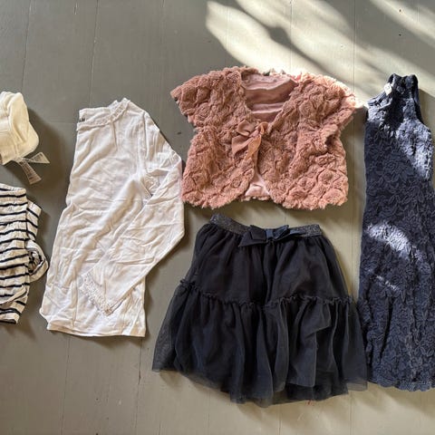 Pakken inneholder to fine kjoler, to bluser, en pyntejakke og 1 skjørt. Klærne er veldig fint brukt.