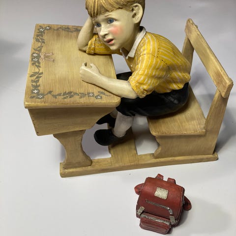 Jente som sitter ved pulten, skolebarn. Kr 425