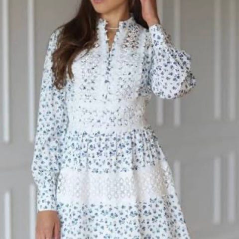 Kjole fra Marie Philippe i str. 42. Kjøpt til et bryllup, men endte opp med en annen, derfor er denne helt ubrukt. Kjolen har knyting i livet, knapper foran på brystet og glidelås i siden. Kjøpt sommeren 2024 med 30 % rabatt. Ordinær pris 1999,-