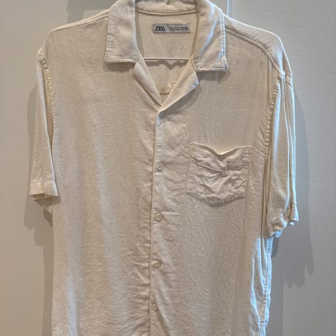 Som ny. Aldri brukt. Strukturert poloskjorte i en myk, kremhvit farge fra ZARA. Åpen hals uten knapper og diskret mønster i stoffet gir et lett og behagelig uttrykk.