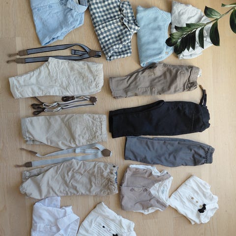 Klespakke selges. Str 68/74. Pakken inneholder 1 blå romper/selebukse, 2 bodyer, 1 vest, 1 finjakke, 12 sokkepar, 10 smikker, 1 par boblesko.