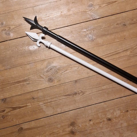 Selger 2 stk gardinstenger i metall med tilhørende endestykker.
