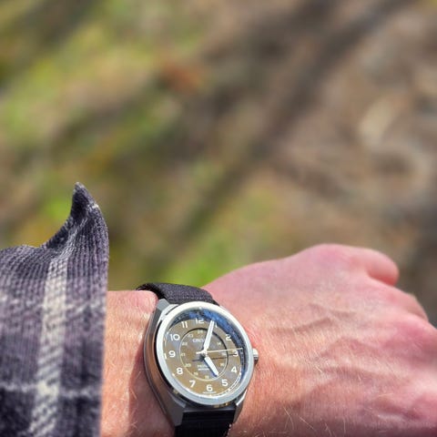Selger en Certina DS-2 med den karakteristiske turtle back-kassen i stål og en spesiell grønn skive. Klokken måler 38 mm uten krone og drives av et solid manuelt sveitsisk verk.