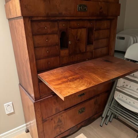 Gammelt, koselig skatoll med utfellbar klaff til skrivepult. Skuff og små hyller.