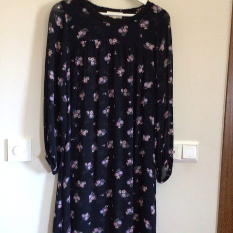 Kjole fra vero moda i mørkeblå basefarge, med blomstrer på. Kjolen har fint glatt stoff, og strikkbånd i midjen.