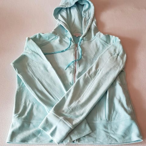 Tynn turkis hettegenser med glidelås og 2 lommer foran fra Pineapple by Debbie Moore for Debbenhams, skrift på venstre arm. Str 42. 92% bomull, 8% elastan. Hentes Oslo eller sendes mot porto.