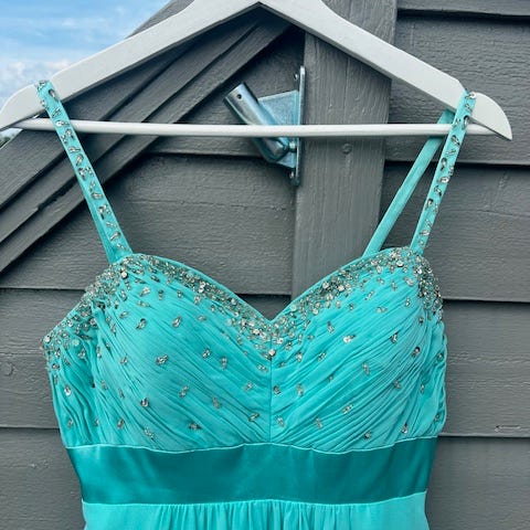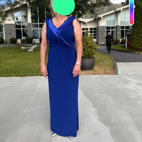 Denne er skreddersydd i en brudebutikk i Bergen. Brukt en gang i bryllup. Den har et elegant snitt, perfekt for formelle anledninger. Materialet gir en glatt og skinnende overflate som fremhever kjolens stilige utseende.