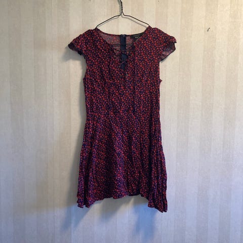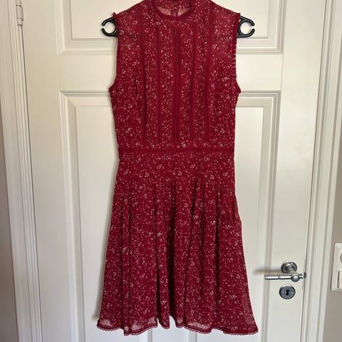 Pen rød solkjole med blomstermønster fra Monsoon i 100% bomull. Foret med tynt bomullsstoff. Opprinnelig engelsk str 14, men sydd inn i livet og på skulderstroppene til str S. Aldri brukt.