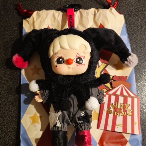 Kun åpnet, med qr kode som kan verifiseres på Pop mart sin hjemmeside. Kjøpt hos Pop mart, esken og kort følger med.