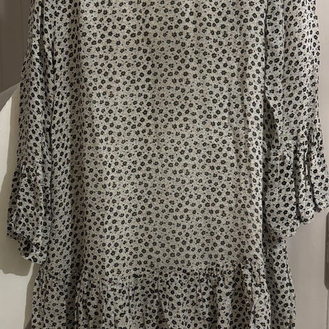 Ny Gina Tricot Daisy bluse med fine detaljer. Svart med hvite blomster. Puffermer med draperinger. Rytsje/volang hals. Nøkkelhull med knapp (bak). 100% polyester.