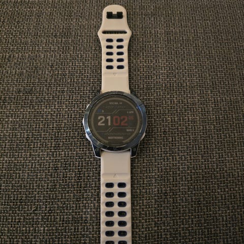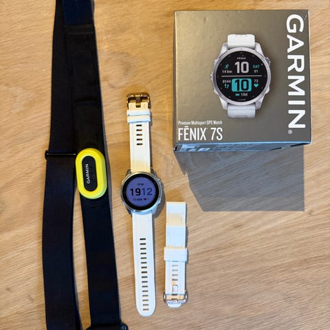 Dette er premiumvarianten i titanium utførelse med orginalt fog gray/ember orange reim. Medfølger eske, lader og kvittering (sendes på epost, 2.eier). Pent brukt, normal slitasje rundt bezel. Ingen riper i skjerm. God batteritid.