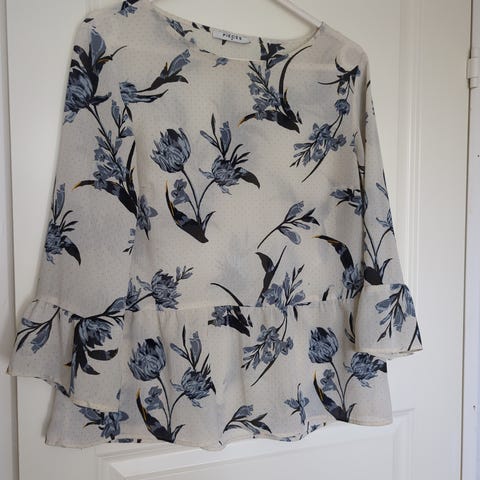 Har en nydelig bluse fra merket PIECES. Det er en hvit bluse med små gule prikker og nydelige blå blomstre på. Armene og nedentil på blusen har som volanger på seg. Den er litt gjennomsiktig så man kan bruke noe under om man ønsker det.