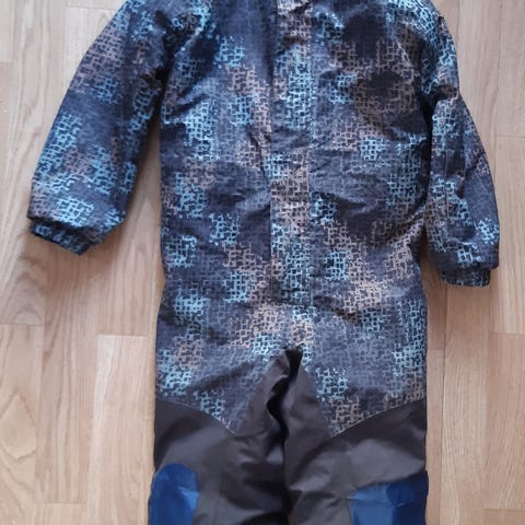 Noen slitasjemerker. Mangler hetten. Ellers varm og god. Mye bruk igjen. Ingen slitasje på rompen og knær, men en slitasje med hul på bein på siden (ved sømmen, så kan sys)