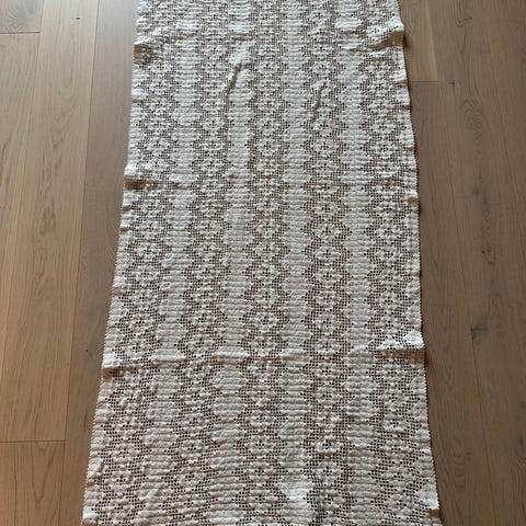 Håndheklet med tynt bom.garn. Innvendig mål ca 1 m x 1 m. Passer som kant rundt grov duk el ev et sengeteppe.