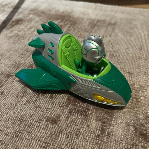 Pysjheltene Gecko med Månekjøretøy. To figurer, en mini kattebil og en grønn motorsykkel.