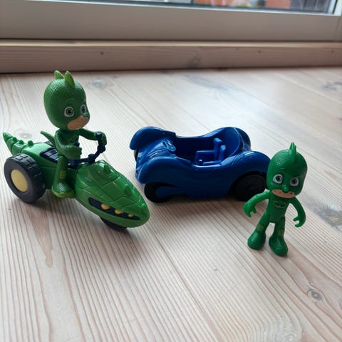 Pj masks gecko figur med månekjøretøy, kattegutt sin kattekjerre, mini kattebil, to pez-dispenser og en lommelykt.