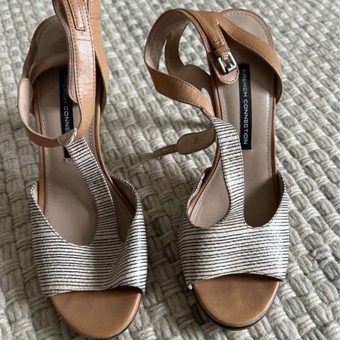 French Connection pumps i størrelse 37. Laget i beige skinn, disse skoene har en klassisk design med spiss tå. Selges rimelig grunnet skader på hæler, se bilder, ellers i god stand.