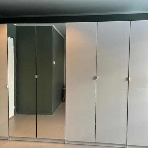 Blanding av hvit høyglans og speildører.