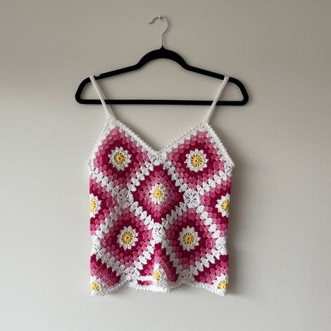 Søt rosa topp fra Cider i str S, med hjertemønster. Passer perfekt til sommerfester, festival og strand. Knyting øverst i nakken. Knyting på brystet kan ikke justeres på, er sydd fast.