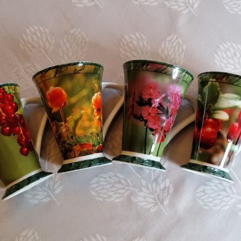 Krus og tallerk med blomstermotiv fra Jon Østeng Hov. Kan selges enkeltvis. Kr 150 pr sett. Hvitveis kun kopp kr 75.