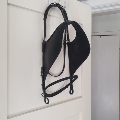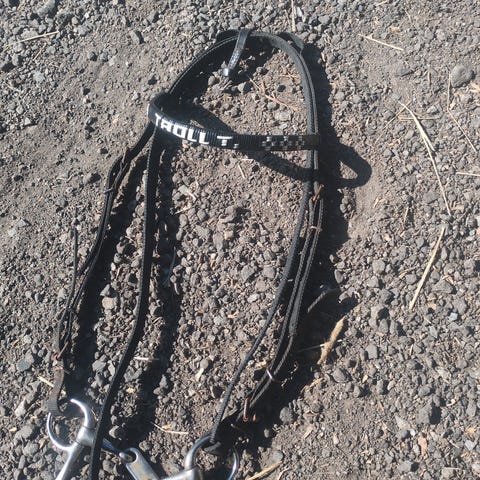 Sort syntetisk travhodelag, med framsjekk og sjekk bitt, rett gummi travbitt. Ellers komplett som på bildene. Sender kun med forhånds betaling på.vips. kjøper må å vipse til frakt. Tlf 98458638.