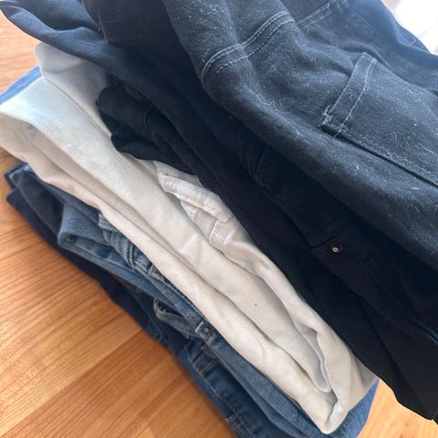 Mørkeblå, lyseblå og sorte bukser i str S, to sorte og to hudfargede BH-er i str 80C, tre sorte og en hvit singlett i str S. Alt er helt, rent og fint. De sorte buksene er litt slitt i strikket.