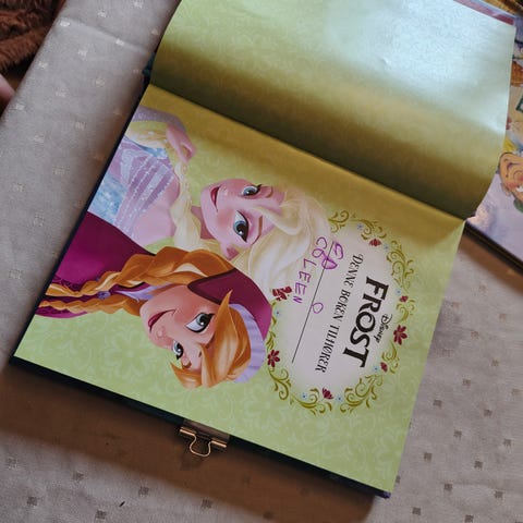 For det meste nye/ ubrukte aktivitetshefter selges samlet. Det ene settet med Frost er noen klistremerker plassert på riktig plass i boka. Resten av klistremerkene følger med. Det andre settet med Frost er helt nytt/ ubrukt. Notatboka er ubrukt. Det siste heftet med å lage egne stjerner er så vidt prøvd. Dette er klistremerker som kan brukes flere ganger.