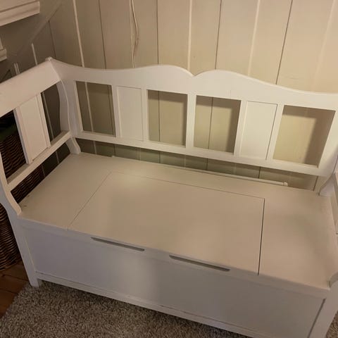 Hvit benk til salgs fra Oliver Furniture i barnestørrelse. Stort oppbevaringsrom under sitteplaten.