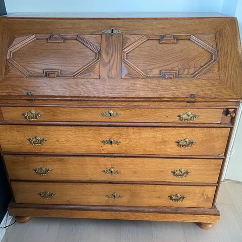 Selger et nydelig antikt telefonbord i solid treverk med vakre, buede ben og en liten skuff for oppbevaring. Perfekt for deg som ønsker å tilføre hjemmet et snev av retro eleganse!