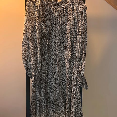 Kjole i engelsk blonde med generøs elastisk halsåpning og raglanerm med dobbel kappeerm. Kjolen er foret, har elastikk i livet og løst knytebelte i vevet kvalitet.