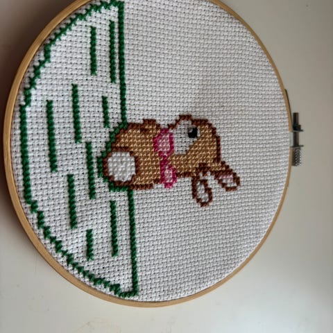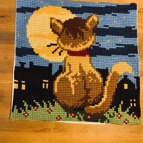 Vakker korsstingskunst med delikate rosa, hvite og grønne nyanser. Dette pent brukte kunstverket er perfekt for å tilføre et snev av eleganse til ethvert rom. Detaljert og nøye utført, vil det være et flott tillegg til din samling eller som en gave til en kunstelsker. Selges til en rimelig pris, og kan hentes etter avtale. Ta kontakt for mer informasjon eller for å avtale visning. Dette er en unik mulighet til å eie et stykke håndlaget kunst.