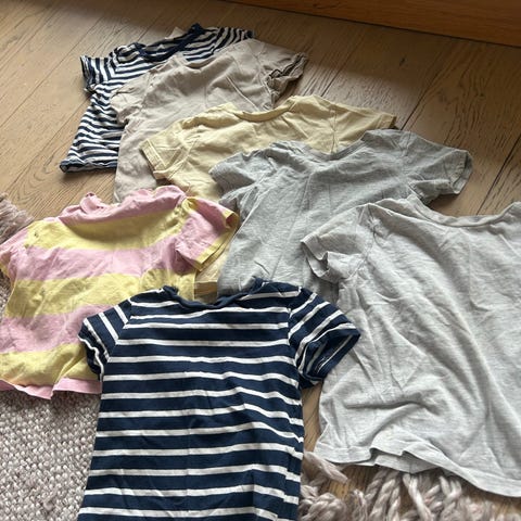 Liten klespakke i str 86. Den oransje teskjorten har svarte flekker på som jeg ikke får av i vask. 3 av shortsene er hjemmesydd. Den rosa står str 80 i og en fra Gullkorn står 86/92, men brukt samtidig med det andre.
