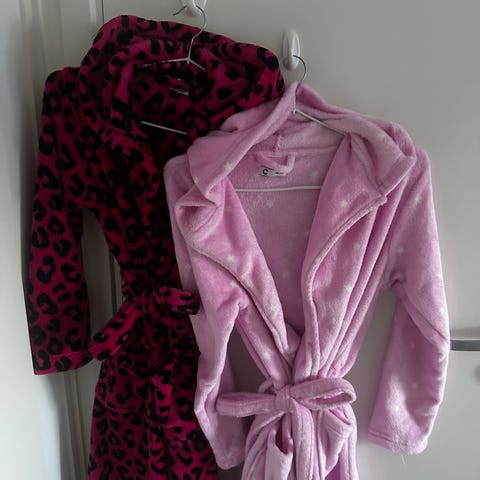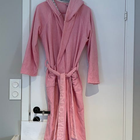 Søt rosa, tynn morgenkåpe med små hjerter og blondekant. Størrelse XS-S. Brukt av jente 10-12 år.