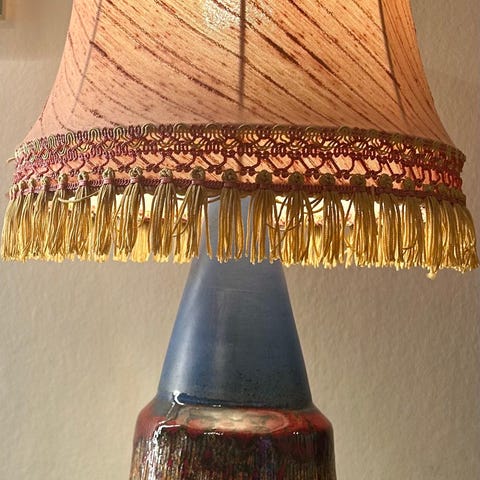 - Vakker lampeskjerm som kan medfølge. Skjermen er nøye og skånsomt rengjort før salg og fremstår som delikat og ren.