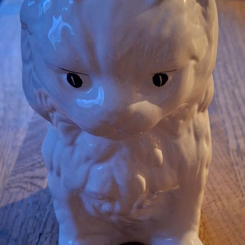 Selger en nydelig vintage matskål fra britiske Mason Cash, laget spesielt for katter. Skålen er laget i solid steintøy og står stødig på gulvet uten å tippe. Innsiden er kremhvit med et trykk av to søte tabby-katter, og har signaturen “Mason Cash”. Utsiden er lyserosa.