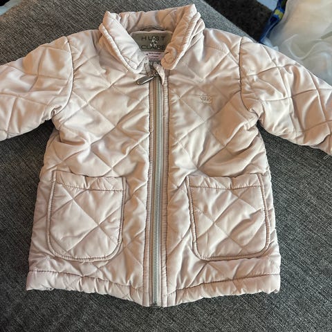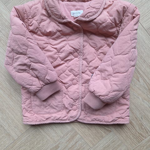 Jakken er str 104. Den kan brukes på begge sider og det følger med en pose til den.