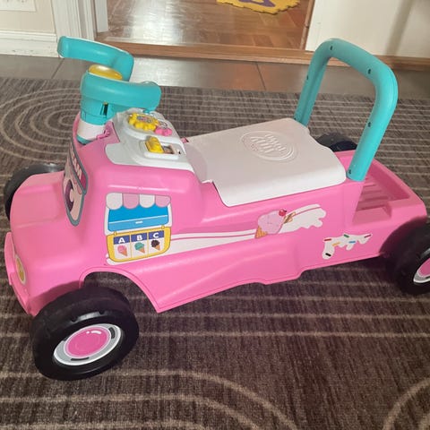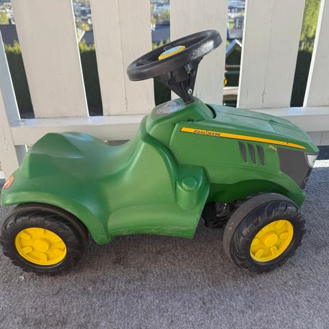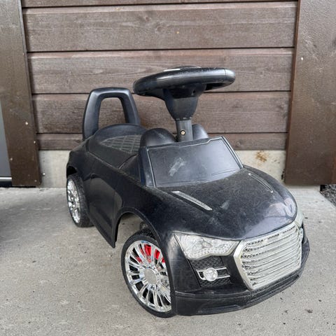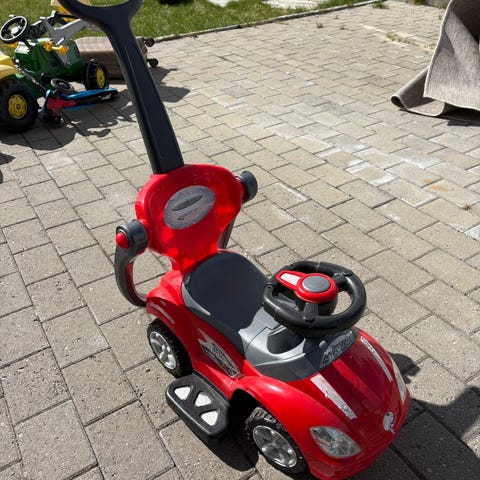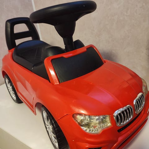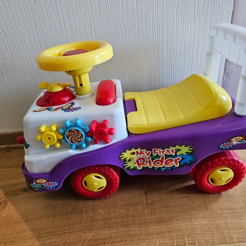 Denne blir ikke brukt lenger hos oss. Fin å leke med for en som nettopp har lært seg å gå eller bare er glad i biler. Med fungerende ratt. Fra et røyk og dyrefritt hjem.