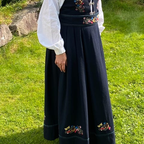 Cape, skjorte, drakt med belte, veske. Passer str. 42-46. Drakten er tatt inn til ca str. 42, men kan enkelt gjøres større. Oppgradert med nye usynlige og praktiske sidelommer. Nye skjorteknapper og drakthekter. Nyrenset. Brukt 3 ganger. Selges pga. ny bunad. Ny pris drakt kr. 1799, ny pris cape kr 699, ny pris skjorte kr. 349. Selges samlet kr. 1.200. Kan hentes eller sendes.