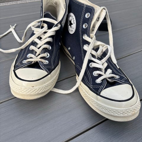 Selger et par pent brukte Chuck Taylor All Star fra Converse til herre i størrelse 44,5. Skoene har en klassisk design og er i fargen blå. De er godt ivaretatt, og har nye lisser. Høyre sko har litt slitasje på høyre side av helen og noen små flekker som sannsynligvis kan fjernes, som vist på bilde 5. Skoene passer perfekt for deg som ønsker et par stilige og komfortable sneakers. Ta kontakt ved interesse eller spørsmål.
