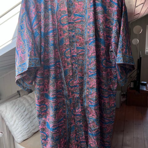 Helt nydelig kimono i lett silke, mangefarget i rosa, gul, brun. Ikke brukt kun hengt i skapet. Str passer Medium.