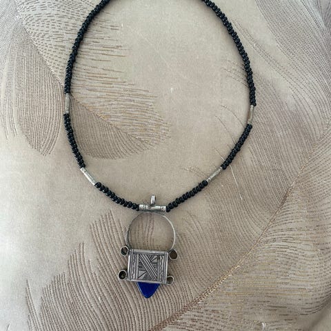 Et unikt og aldeles nydelig vintage kjede med blå steiner. Steinene er ca 2cm og hele smykket er ca 66cm langt. Låsen er svært enkel og bør byttes. Kjedet er like fint på veggen og som pynt som det er rundt halsen eller som armbånd.