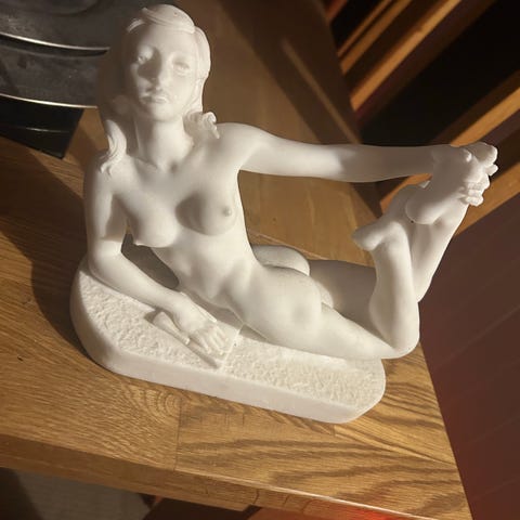 Ca 28 cm høy. Aner ikke hvor den er fra eller hva den er laget av. Begge hendene mangler fingrene. De var knekt av før jeg kjøpte den. Kjøpt på bruktbutikk. Tør egentlig ikke å sende denne, så den BØR hentes på Bjølsen. Jeg KAN derimot sende den på kjøpers ansvar (pakkes inn i bobleplast og papp osv)