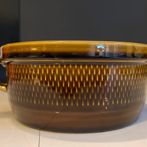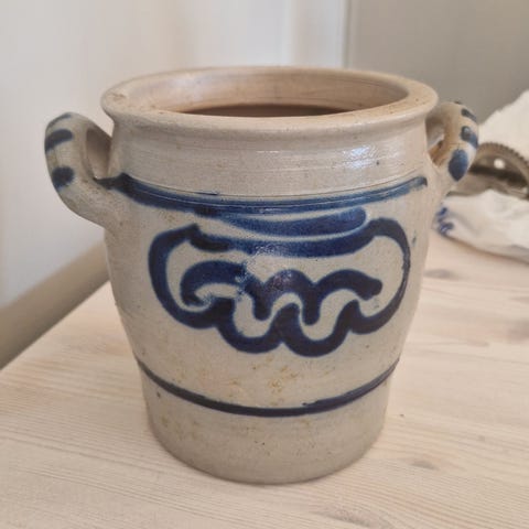 Hollandsk krukke selges for kr. 50. Den har en reparasjon helt øverst som vist på bilde 3.