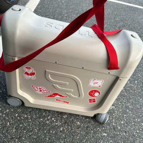 Vi leier ut vår JetKids Bedbox fra Stokke. Den kan brukes til barn som har eget sete på flyet. Den slåes opp og man bretter ut madrassen som er oppi. Jetkids kan også brukes til å oppbevare ting som barnet trenger på flyet. Veldig praktisk at barnet kan sitte på kofferten og bli dratt på flyplassen.