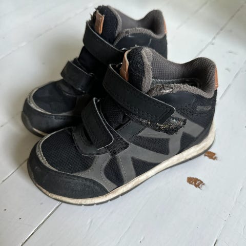 Blå Kavat-sko i str. 22 – perfekte for barn som skal lære å gå. Skoene er myke og fleksible, med god plass til foten og helt flate såler uten hel – gir naturlig støtte for små føtter. Velbrukte og litt slitt i fronten (se bilde), men fortsatt gode i formen og klare for en ny liten eventyrer.