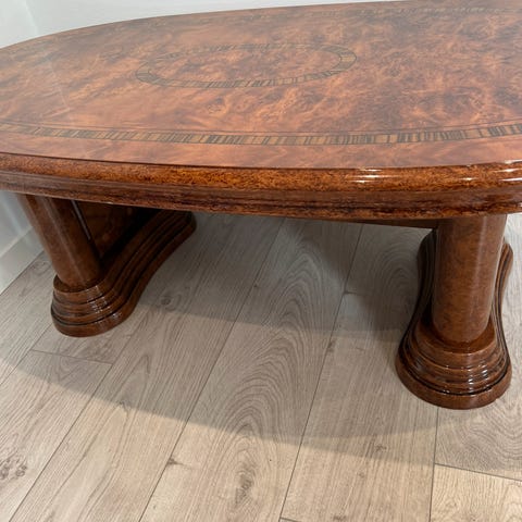 Elegant rundt salongbord i mørkbeiset heltre, antakelig mahogny. Klassiske utskjæringer og solide løveføtter gir bordet et tidløst uttrykk. Bordplaten har tydelige bruksmerker og noen riper, men bordet fremstår som robust og egner seg godt til oppussing, beising eller bruk som det er.