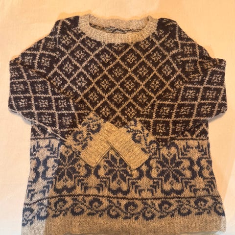 Grå snøløvgenser strikket i air fra Drops str M selges kr 250,-