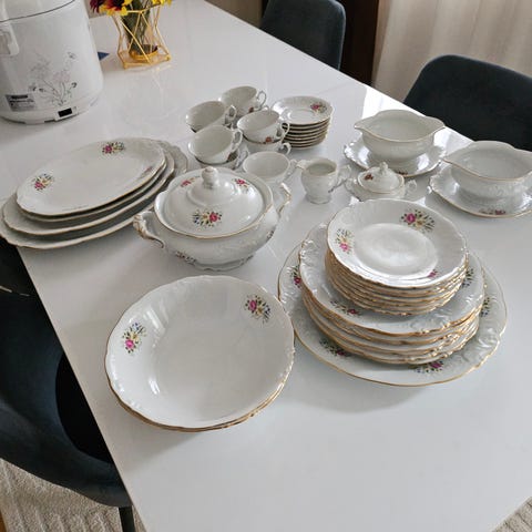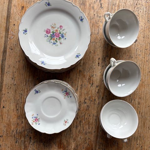 Vintage servisesett i porselen med blomsterdekor. Settet inkluderer kopper, skåler og tallerkener, alle med et delikat blomsterdesign. Perfekt for servering ved spesielle anledninger eller som en dekorativ samling.9stk av hver