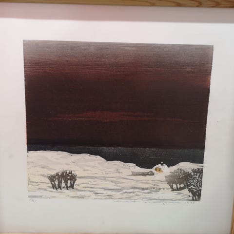 Knut Frøysaa, maler og grafiker (1919-1987). Grafikk 1973 nr. 23/50. Synlig grafisk blad har B=40 og H=48. Pen ramme med mål: B= 58 cm og H=73 cm.